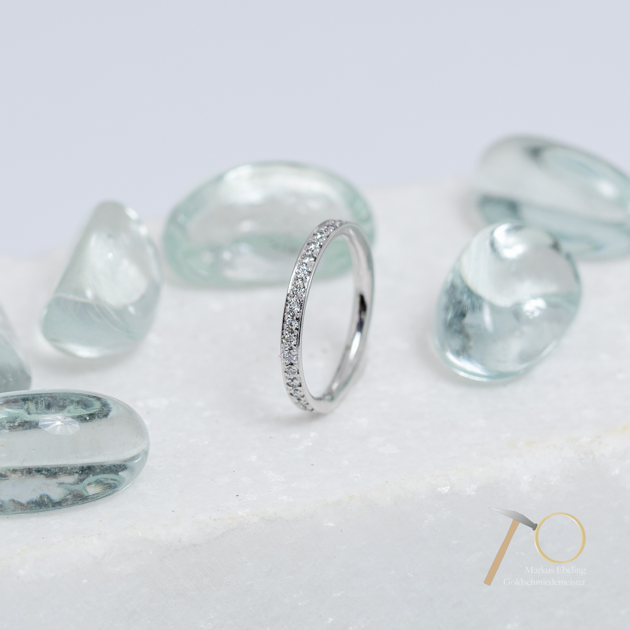 Sie sehen einen handgefertigten Memoriering aus 750/000 Weißgold, entworfen und angefertigt in der eingenen Werkstatt. Die 35 Brillanten sind in Verschnitt, ebenfalls in Handarbeit, gefasst. Der Ring kann sowohl einzeln als auch als Vorsteckring getragen werden. Alle Kanten sind angenehm weich abgerundet.